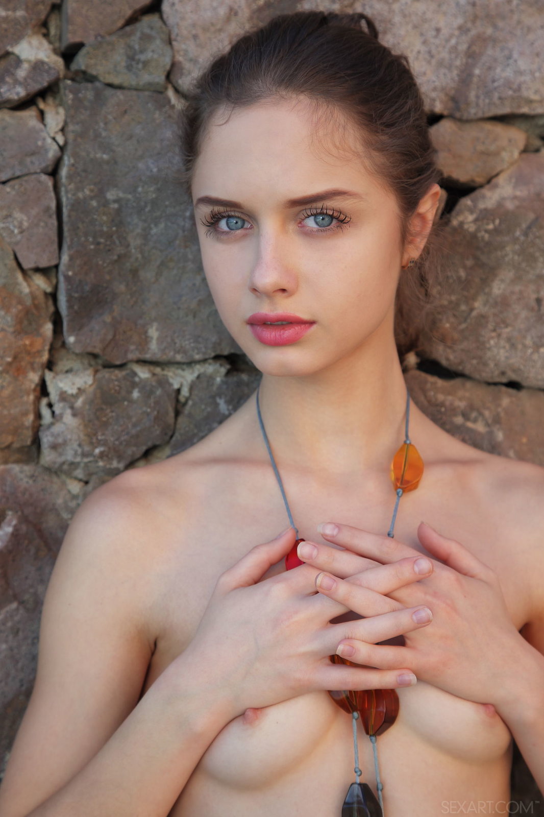 Słodka lalunia ma śliczne, niebieskie oczka i zmysłowe spojrzenie. Słodka porno nastolatka wypina małą dupkę na kocyku pod gołym niebem.