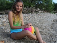 Młoda nastolatka bawi się piłeczką, nie ma nikogo kto by pobawił się z nią, może dlatego że biega nago a jakikolwiek facet widząc taką młodą suczkę na plaży całkowicie nago od razu miałby wzwód i zaraz doszło by do ruchania małolaty na plaży