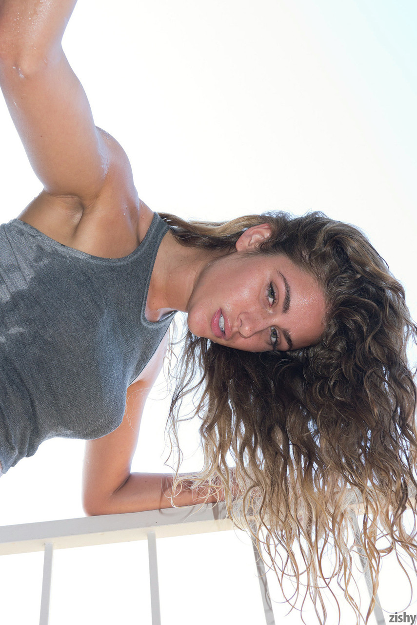 Mega ślicznotka w kręconych włosach ma na sobie białe i mokre majteczki. śliczna porno blondynka wypina jędrne dupsko na balkonie.