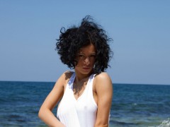 Naturalna brunetka uwielbia słońce, plażę, i morze tak bardzo, ze kiedy tylko znajduje się w jego pobliżu musi się rozebrać i poczuć jedność z naturą, duże naturalne piersi brunetki na plaży, mały pasek włosów łonowych, mokra cipa