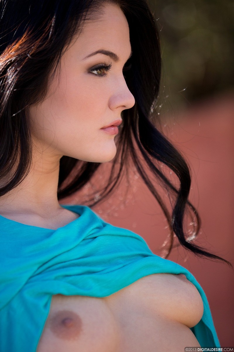 Zmysłowa kocica rozbiera się pod gołym niebem i prezentuje naturalne cycki. Śliczna laska ma sterczące sutki z podniecenia i prześliczne oczka.